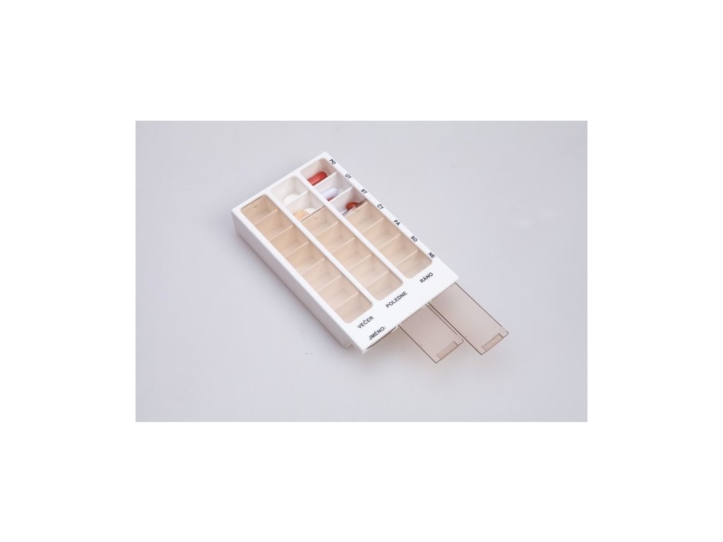 Velikost dávkovače léků: 136 x 81 × 25 mm (d × š × v). Kazeta na léky pro celý týden. Dostupná v několika barevných provedeních. Každý den je rozdělen na 3 části RÁNO/POLEDNE/VEČER. Každá část týdne se otevírá samostatně pomocí vysunutí šoupátka.